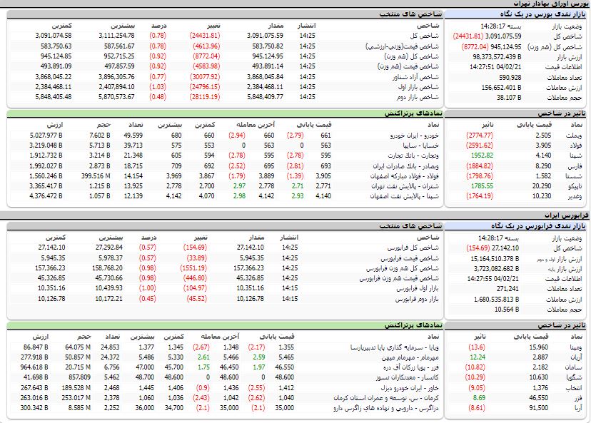 شاخص بورس امروز 21 اردیبهشت 1404 با افت 24 هزار واحدی به 3.091 میلیون رسید. همچنین شاخص هم وزن در روز جاری با 8 هزار واحد افت به 945 هزار واحد و شاخص قیمت با 4 هزار واحد افت به 583 هزار واحد رسید.